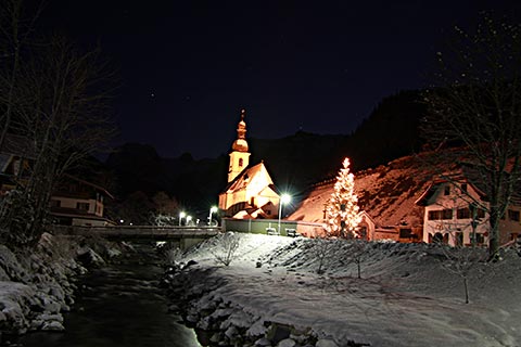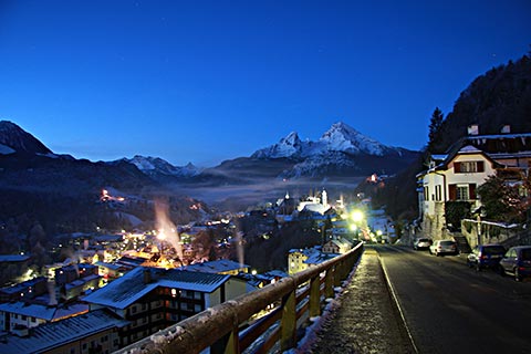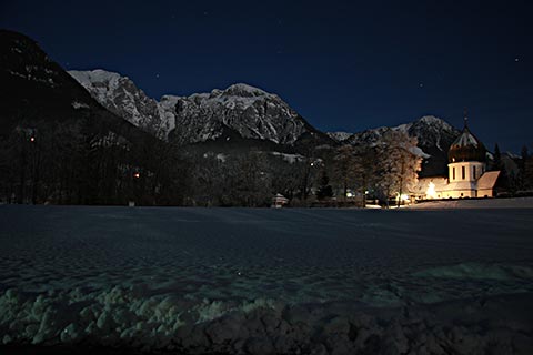 Natürlich geht es auch gemütlicher! Eine abendliche Wanderung durch das verschneite Berchtesgadener Tal hat natürlich auch so einiges für sich. Auf der Kunsteisbahn am Königssee können Sie beim Gästerodeln teilnehmen oder den Abend einfach in der Unterkunft ausklingen lassen.
