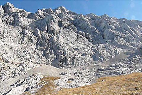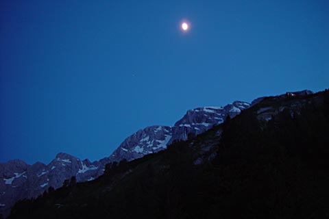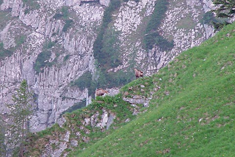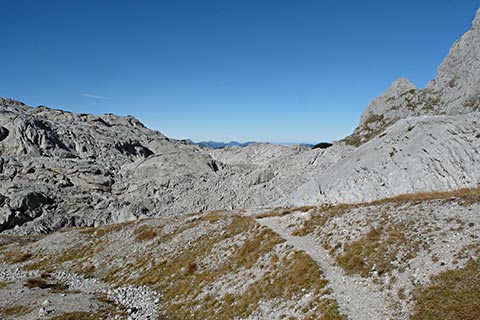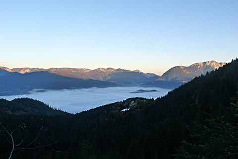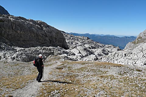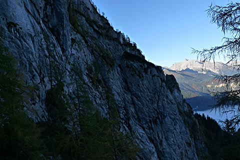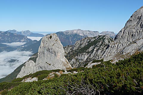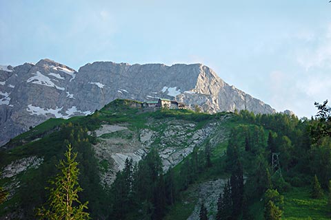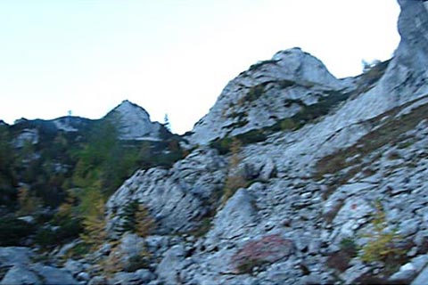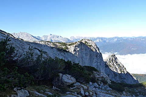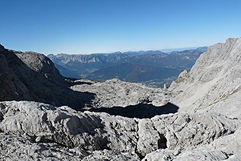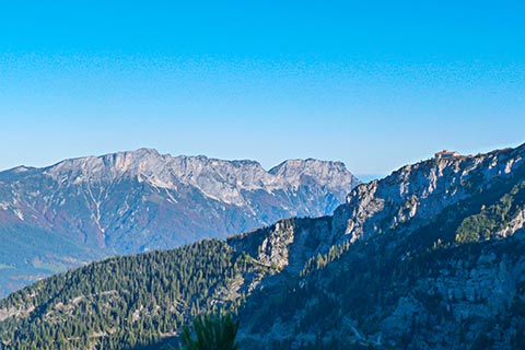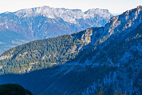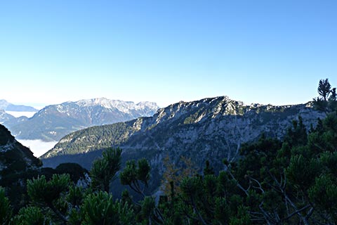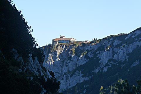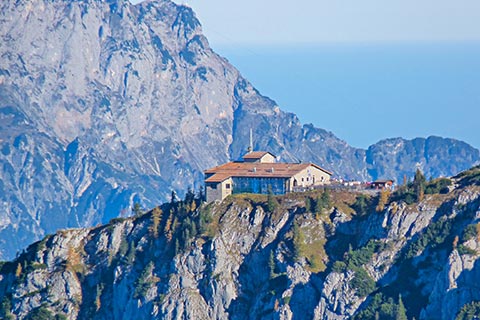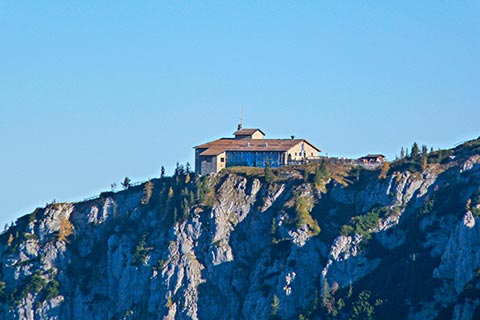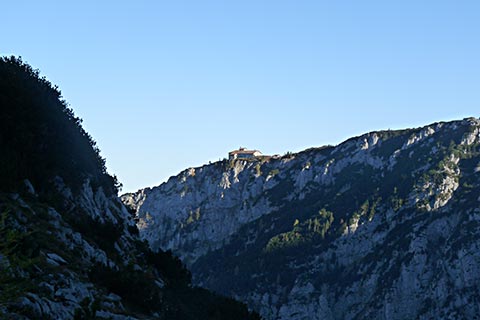 Der Bergsteiger wandert am Purtschellerhaus vorbei bis zum Eckerfirst (1785 m) zur ersten Felsstufe. Von dieser Felsstufe aus sehen Sie rechts das Kehlsteinhaus und links unten den „Wildfreihof“.