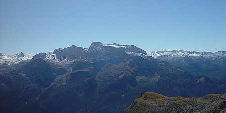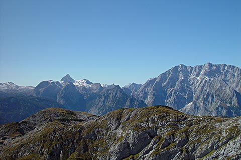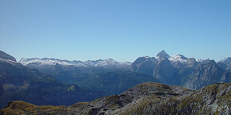 Am Gipfel erleben Sie ein einzigartiges Landschaftserlebnis und einen faszinierenden Ausblick auf den Watzmann, Steinernes Meer, Hagengebirge und Hochkönig im Salzburger Land.