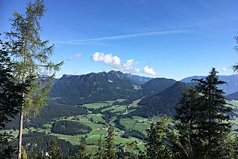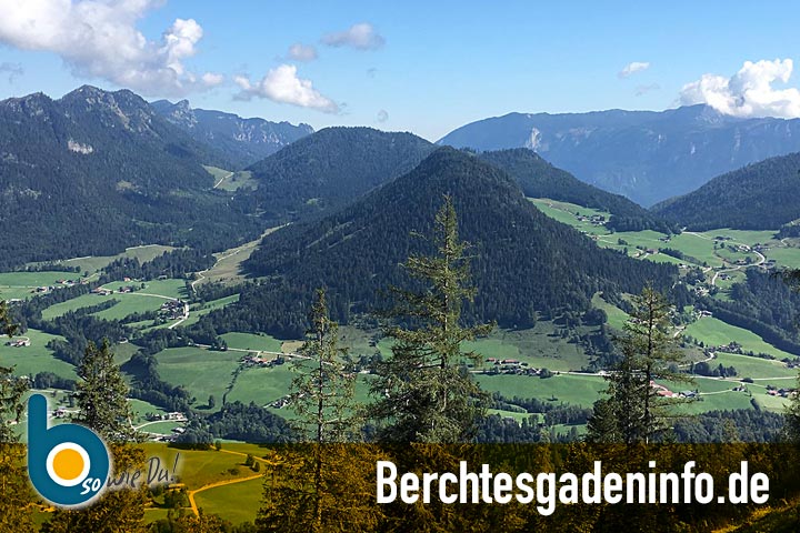 Ein weiterer Punkt für diese Bergtour früh aufzubrechen ist der Sonnenstand. Am Morgen wird die gegenüberliegende Seite von der Sonne erfasst. Für Fotografen ein sehr guter Moment um einen Schnappschuss aus dem Urlaub an die Daheimgebliebenen zu senden. Von der Schärtenalm sieht man in das Bergsteigerdorf Ramsau und hier in das Hochschwarzeck, Hirscheck, den Toten Mann und die Deutsche Alpenstraße. Diese ist gerade bei Motorradfahern und Autowanderern sehr beliebt.