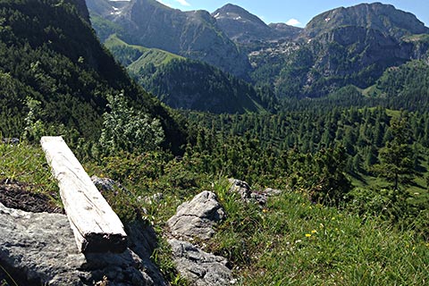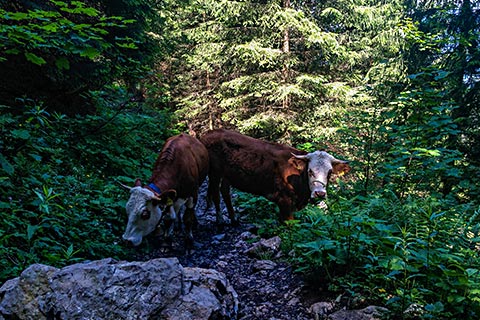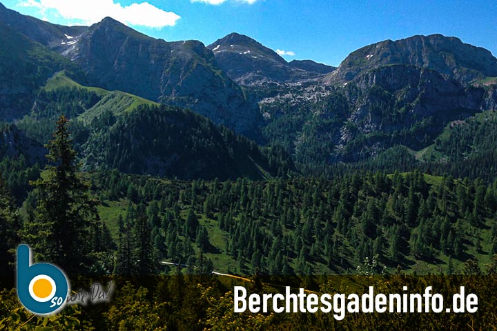 Sie biegen links in die Forststraße ein und folgen dieser. Beim Blick nach links sehen Sie den Kehlstein mit dem Kehlsteinhaus, den Hohen Göll und das Hohe Brett. Rechts um die Kurve rum und Sie sehen links unten einen Kaser. Ortsansässige nennen diesen „Klausmaxei“. Hier lohnt es sich auf eine gute Brotzeit einzukehren. Von hier aus können auch die zuvor benannten Berge bestiegen werden.