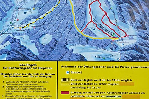 Die Abfahrt nach der Skitour erfolgt dann über die Skipiste wieder hinab in das Tal. Achtung, bitte achten Sie nach Beendigung des Skibetriebes auf die Fahrzeuge der Pistenpräparation und denken Sie auch immer an die Tiere, die im Winter sehr viel Energie benötigen, wenn Sie durch „Querfeldeinfahrer“ aufgeschreckt werden.
