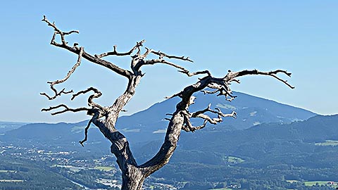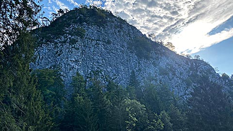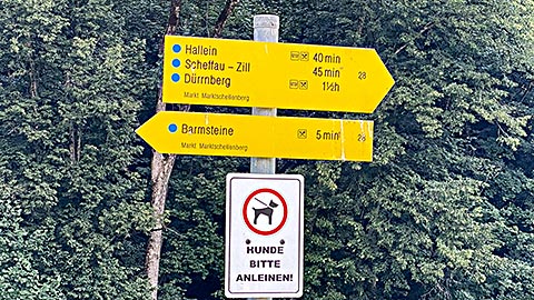Wir wandern einen Anstieg hinauf zum Friedhof. Rechts hinter dem Rücken sieht man hier schon sehr schön den Untersberg. Wir folgen der Beschilderung und merken uns die nächsten Stationen Bichlhof und Mehlweg. Zu erst erreichen wir den Bichlhof und wandern nun weiter über den Mehlweg. Der letzte Teil führt durch den Wald und stellt den Wanderer vor die Wahl auf welchen der beiden Barmsteine er steigen möchte.