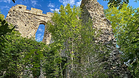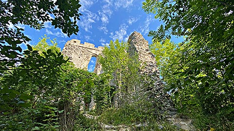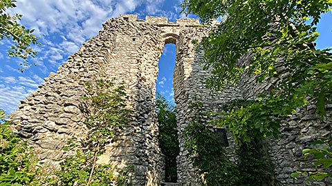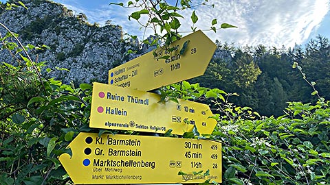 Nun kann der Rückweg direkt erfolgen. Alternativ kann man noch die Ruine Thürndl besuchen, die unweit der Barmsteine steht. Heute findet man noch ca. 9x10 m große Überreste eines Turms. Thürndl gehörte früher zur mittelalterlichen Stadtbefestigung von Hallein. Die Geschichte geht hier bist ins 13. Jahrhundert zurück. Man kann auf einer Tafel lesen, dass dieser Turm noch bis ins 16. Jahrhundert noch von einem Wildhüter bewohnt worden ist. Direkt am Turm führt im Übrigen auch der Arnoweg vorbei. Auf einer Tafel kann man lesen, dass die Überreste 2011 gesichert wurden. Auch wurde mir gesagt, dass bei dem Turm ein Geocache versteckt ist. Also auch hier viel Spaß.