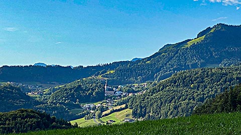 Wir parken unser Auto direkt in der Nähe der Kirche in Marktschellenberg. Das ist die Gemeinde in Berchtesgaden, die direkt an Salzburg angrenzt. Auch hier können Sie ihren Urlaub in einer Ferienwohnung oder in einem Zimmer von einem Privatvermieter verbringen. Mein erstes Ziel ist immer der Bäcker gleich neben der Kirche. Was gibt es schöneres als eine frische Breze bei einer Wanderung. Aber nun geht es wirklich los. Wir beachten wieder die gelben Schilder für die Wanderer. Die Beschilderung ist wirklich sehr gut.