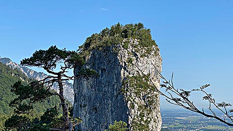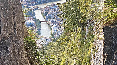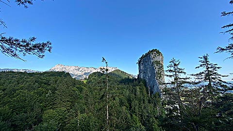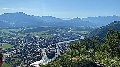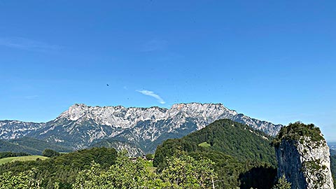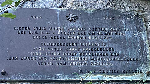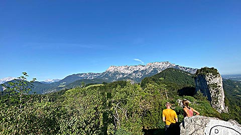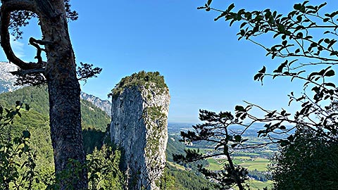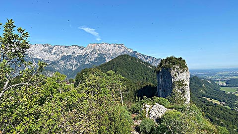 Ich empfehle den kleineren Barmstein. Hier am Fuß des Stein steht bereits das Hinweisschild, dass hier nur die Könner rauf gehen sollen. Es geht über Stufen hinauf. Darauf hin folgen Felsen und Trittstufen im Stein. Der Weg ist mit Seilen gesichert. Trittsicherheit und Schwindelfreiheit ist aber unbedingt notwendig. Spätestens wenn man über einen Spalt quer über die Wand nach Hallein schauen kann. Ganz oben angekommen hat man einen phantastischen Blick. Dieser Reicht vom gesamten Tal von Berchtesgaden mit Hoher Göll, Hohes Brett, Watzmann, Reiteralpe bis zum Untersberg. Aber auch das Salzburger Land breitet sich aus. Auf der Bank auf dem Gipfel lässt es sich lange aushalten.