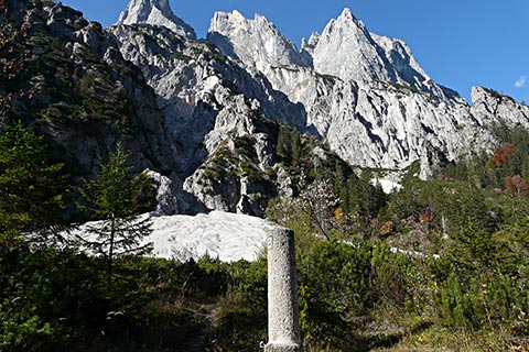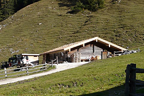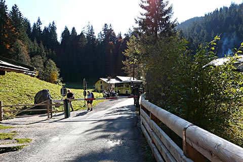 Hier finden Sie ein klassisches Ensemble von Almkasern, so wie diese früher überall auf den Almen zu finden waren. Die Betreiber bzw. die Bewohner der Kaser sind die Sennerinnen und Senner, die zu einem bäuerlichen Anwesem im Tal gehören. Auch findet man hier einen so genannten Rundumkaser. Hier wohnt die Sennerin im Zentrum des Gebäudes und rundherum ist der Stall mit den Tieren. So wurde der Wohnbereich für den Senn durch die Tiere warm gehalten. Dieser Kaser trägt den Namen Schiedkaser und stammt ursprüglich aus dem 18. Jahrhundert. Gebaut wurde er auf der Feld-Alm im Steinernen Meer. Dort wurde er abgebaut und originalgetreu hier im Klausbachtal wieder errichtet.
