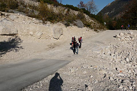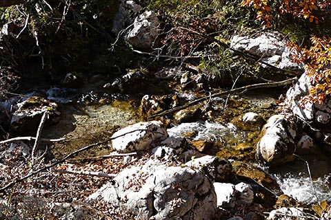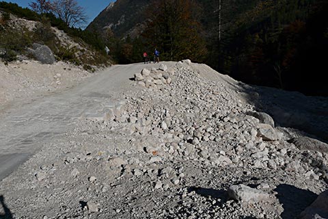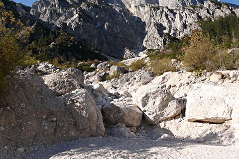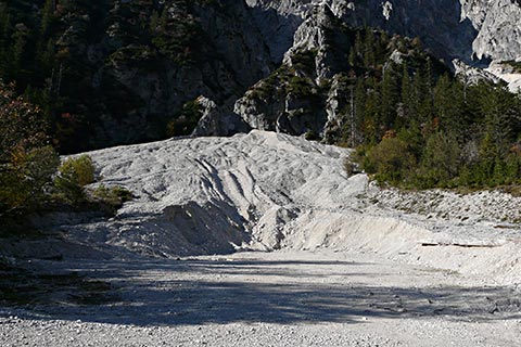 Durch Verwitterung brechen aus den Dolomitwänden der Mühlsturzhörner fortwährend Gesteinsstücke heraus und bauen einen Schuttkegel auf. Bei Schneeschmelze und Starkregen werden größere Schuttmassen vom Wasser mitgerissen. Muren verschütten zum Teil die Straße und dringen auch deutlich sichtbar in die angrenzenden Waldbereiche ein. Die Ränder des Mühlsturzgrabens sind von Latschen bewachsen. Mit ihren biegsamen, mehr oder weniger dem Boden anliegenden Ästen können sie Schuttbewogungen sowie den Abgang von Schneelawinen überstehen.